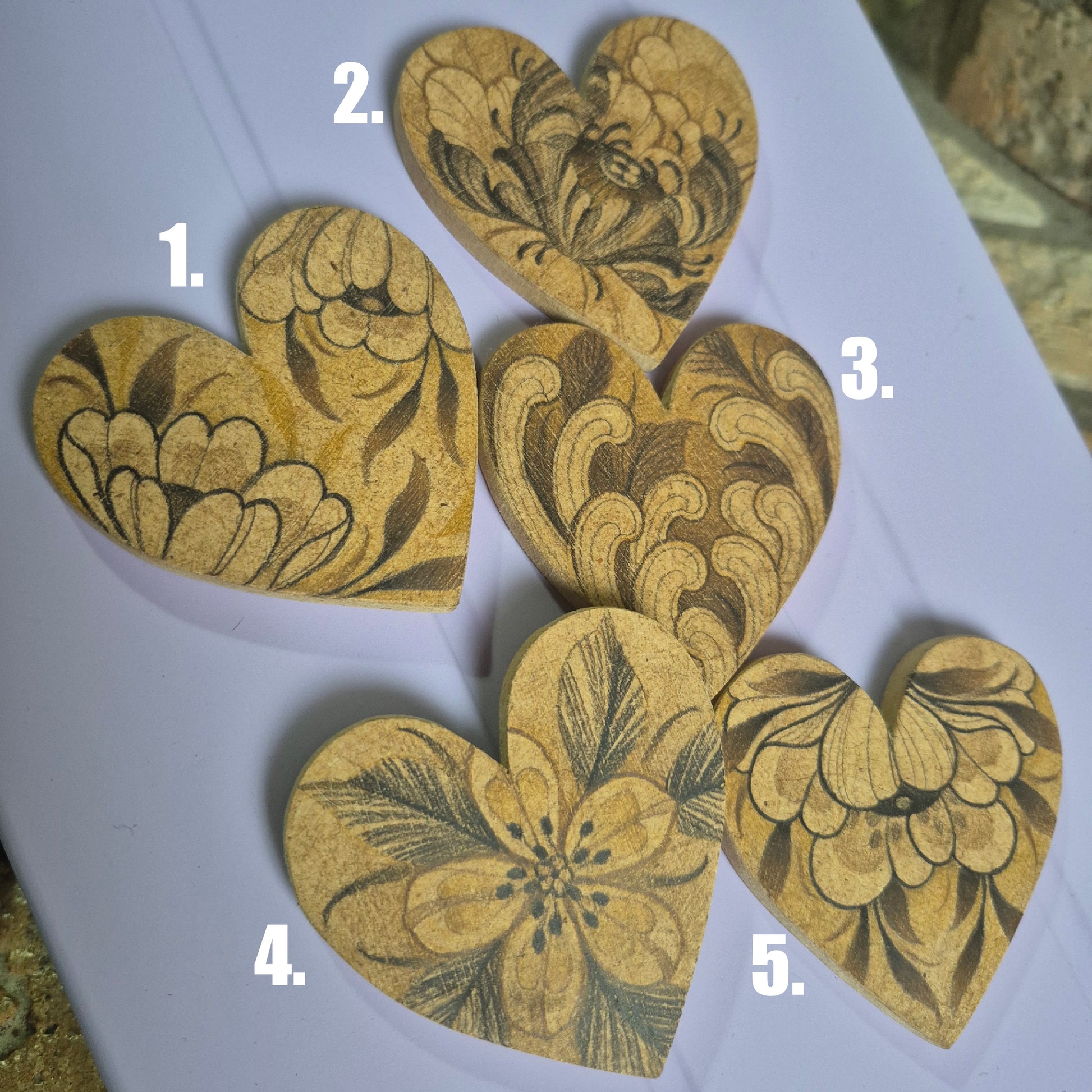 Voici 5 petits cœurs en bois coupés, poncés et ornés à la main, ils sont donc tous uniques ! Je peux rajouter un aimant, une attache murale dorée ou le garder tel quel pour le poser.