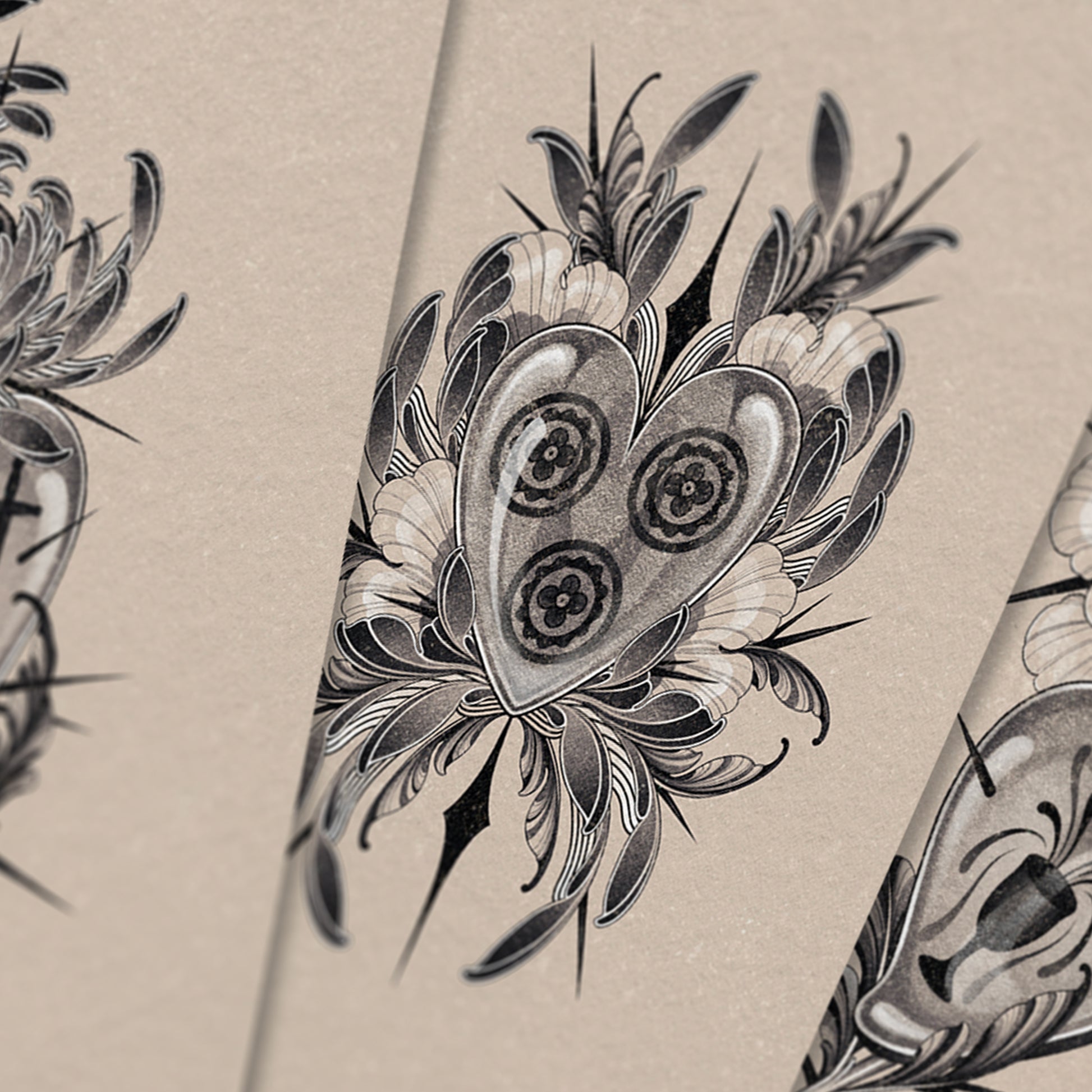 Ce triptyque représente trois des quatre éléments du tarot : les épées, les deniers et les coupes, respectivement Blade of Heart, Gold Blood et Drip in love.