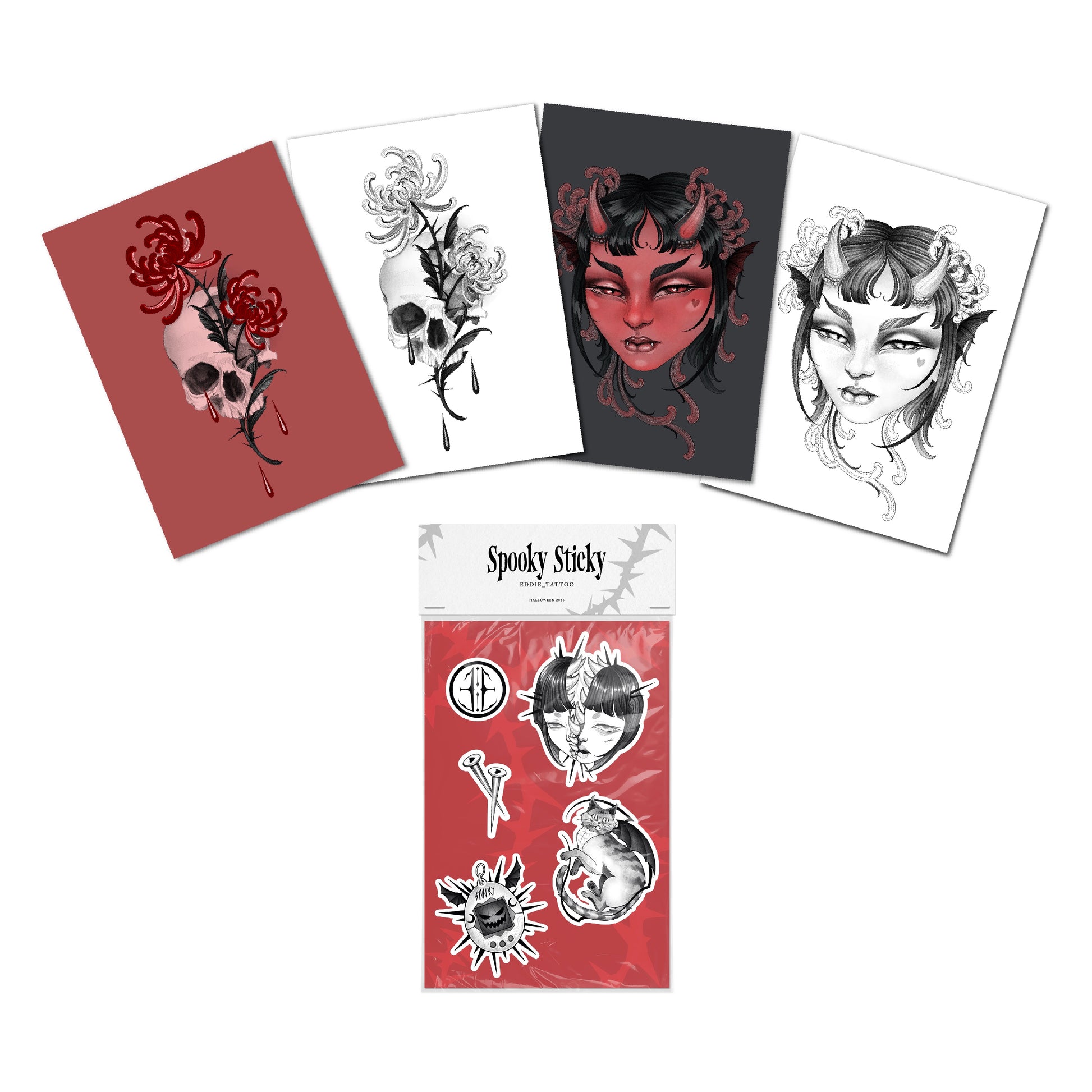 Voici la collection Halloween Holly Blood ! Tu pourras y trouver 4 illustrations imprimées format carte postale et une super planche de stickers pour pimper ta gourde, ton pc, ta switch ou juste à collectionner !